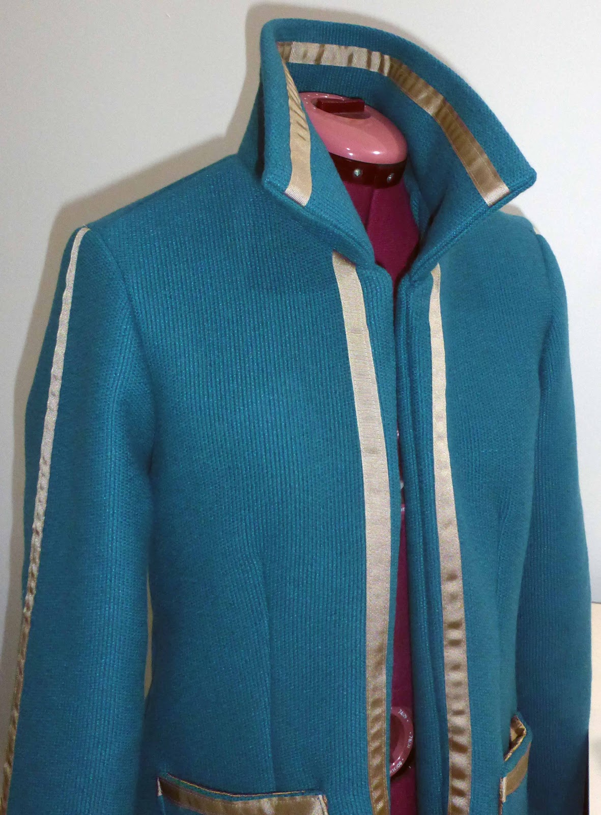 Once I start sewing on the Berisford grosgrain ribbon, I got an idea of how the coat might look.
