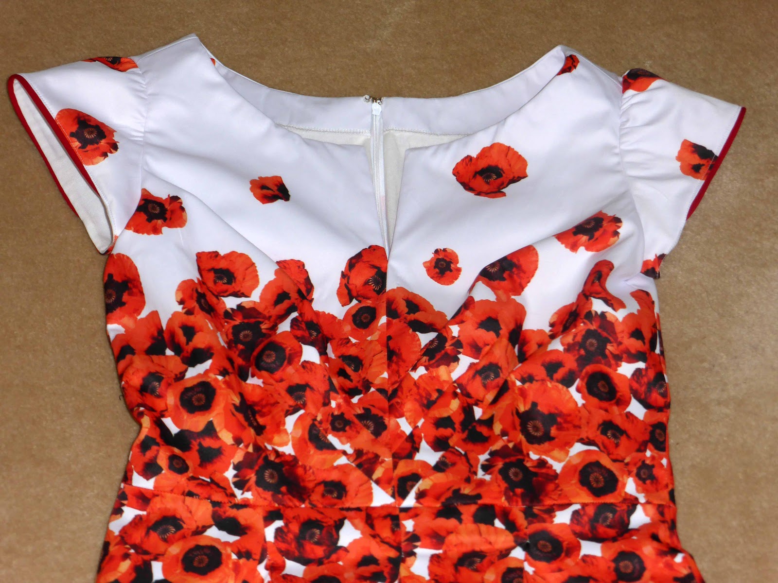 I had a thing for piping and this WIP picture shows you the sleeves with red piping. The red is not exactly the same as the poppies but it works.