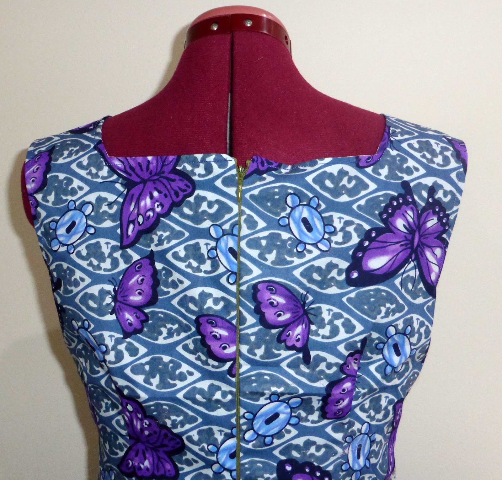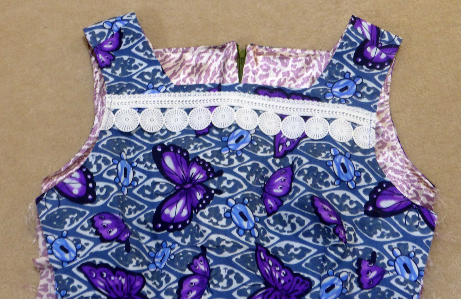 I’ve used full lining in the animal print for this dress. What you see above is the interfaced neckline and the lining now stitched to the dress. The square needs to be clipped before trimming back the seam allowance.