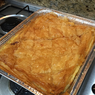 3. Butter a 33 x 23 cm (13 x 9inch) oven dish. I use alfoil dishes because I usually make this dish as a gift, hence no need to retrieve a loved container later. Place half of the fillo pastry sheets in the dish, brushing each sheet with melted butter. Once you get used to the way the pastry sheets handle, this will be easy to do in future.