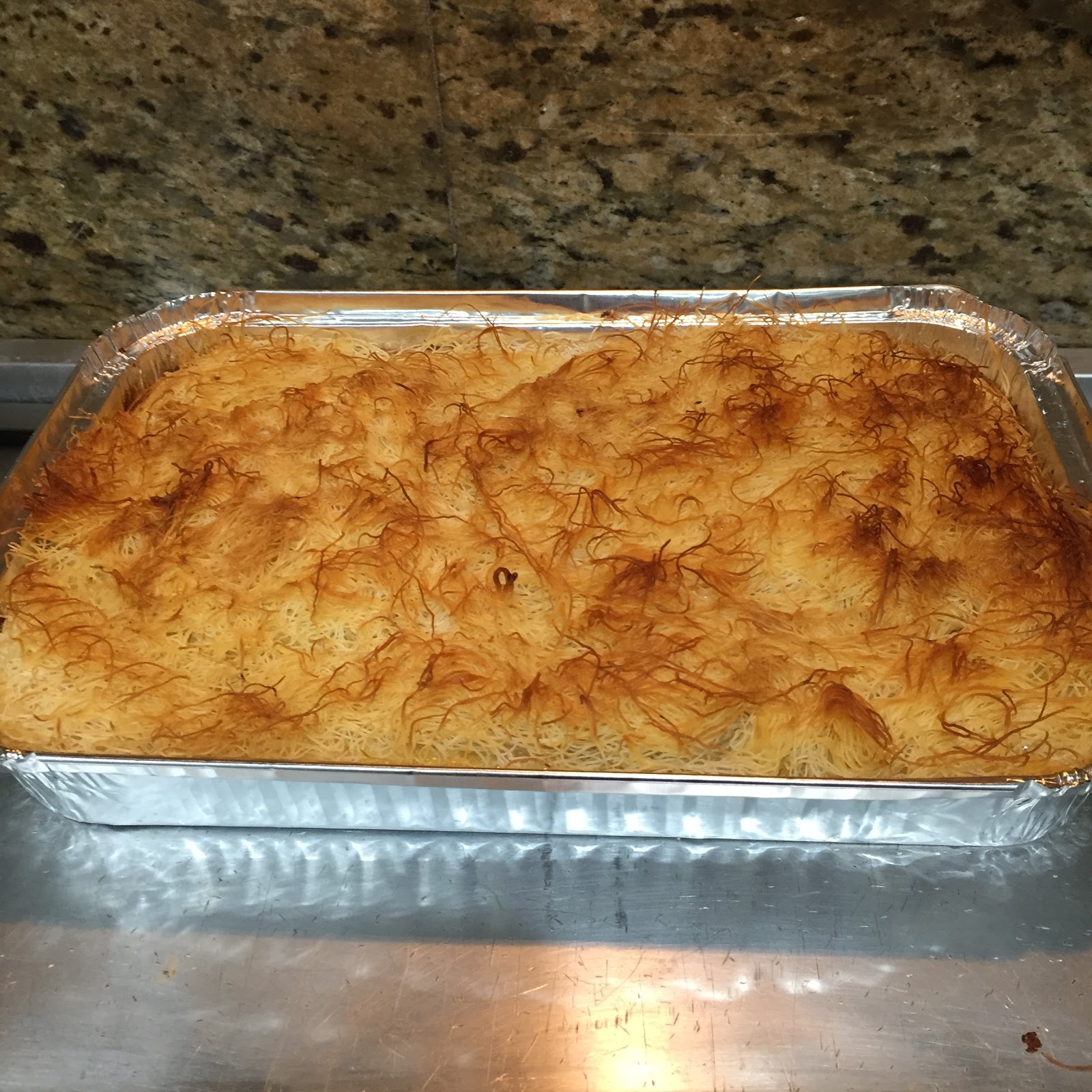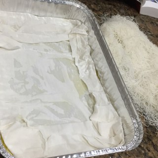7. Place half the kataifi over the base and press it so it’s compact. I place one layer of filo pastry on the base to keep the custand off the alfoil.