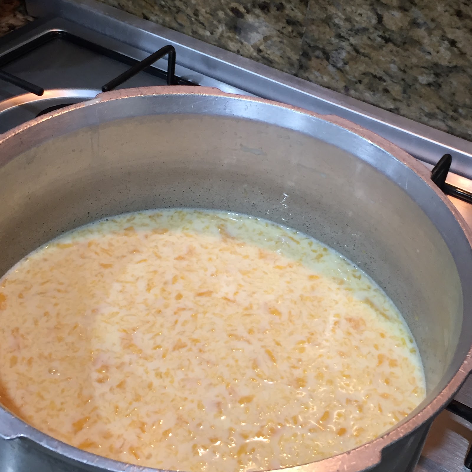 2. Blend in beaten eggs and add salt and sugar. Place over medium heat and stir constantly until thickened and bubbling.