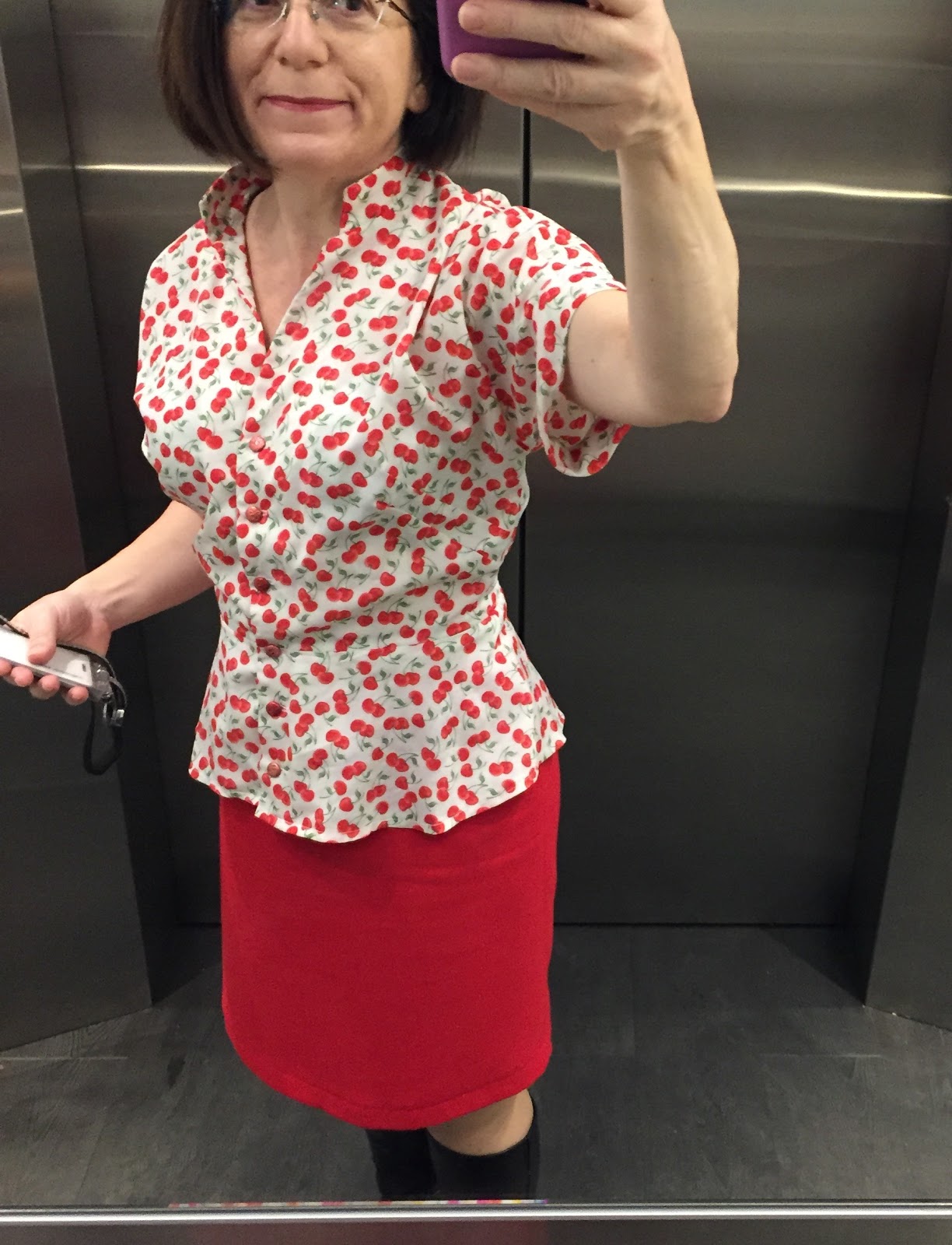 Last year I used the white cherry print fabric to test this vintage style blouse using Simplicity 1460. I wear this to the office a lot.