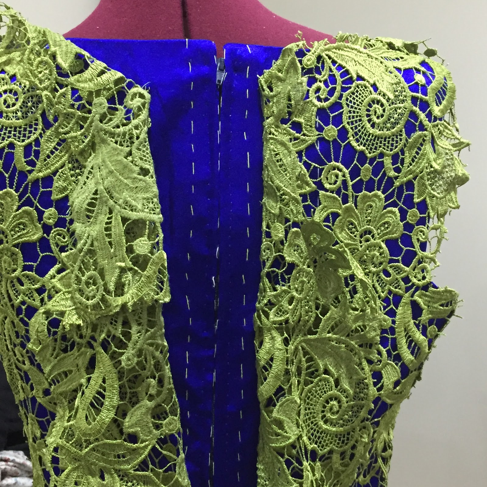 This photo gives you a glimpse of the lace matching work that I had to do so the back lace is uninterrupted and fits my shape.