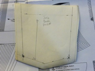Here’s the resized pocket pattern. I’ve cut it back so that it’s 3/4 size – slightly smaller – so I could experiment with topstitching.