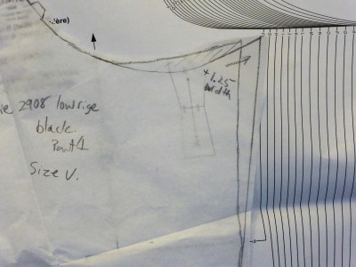 This final trick uses the front pocket piece extending to the centre front seams to act as a front stay. The Prym curved ruler helped me shape this front stay smoothly.