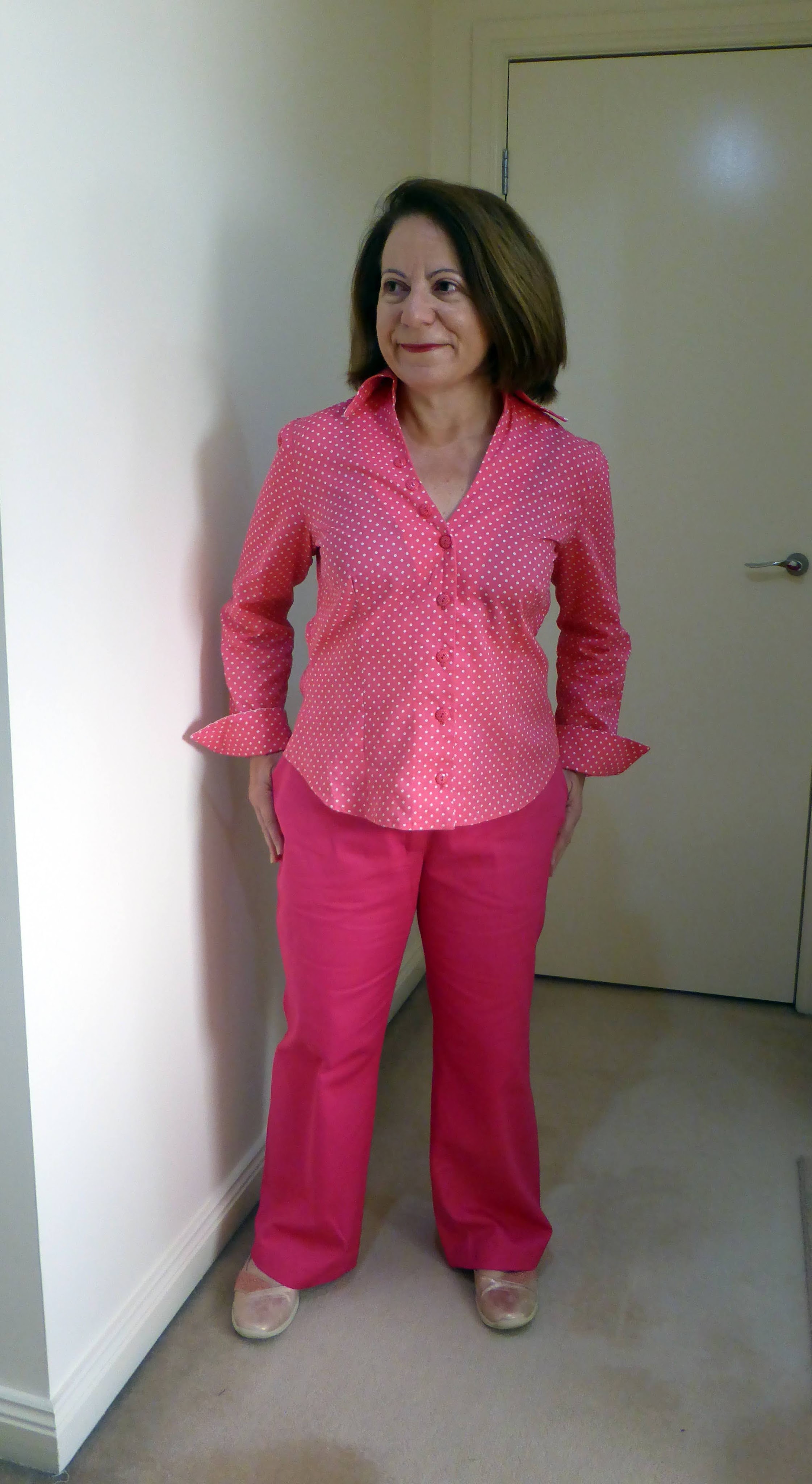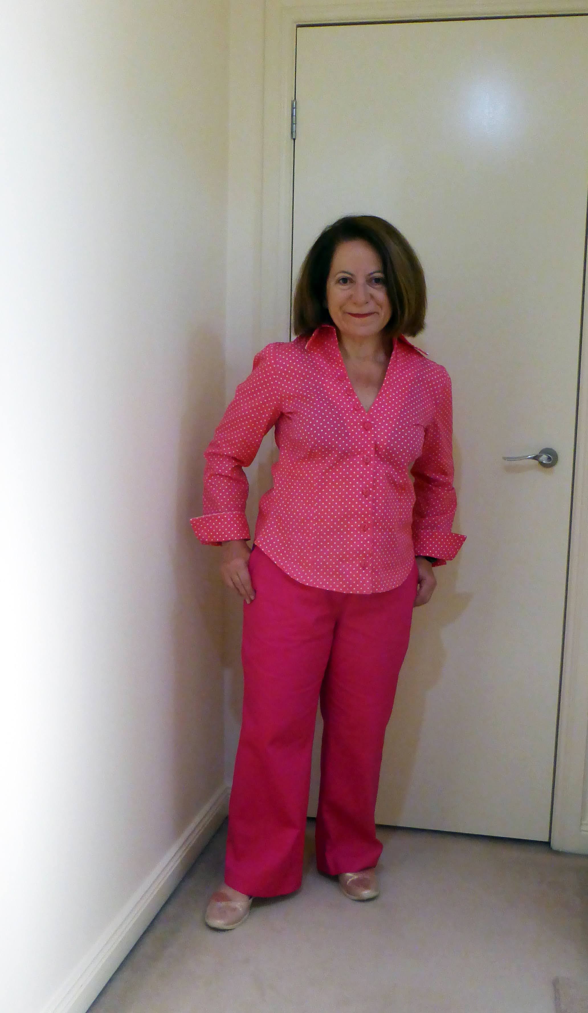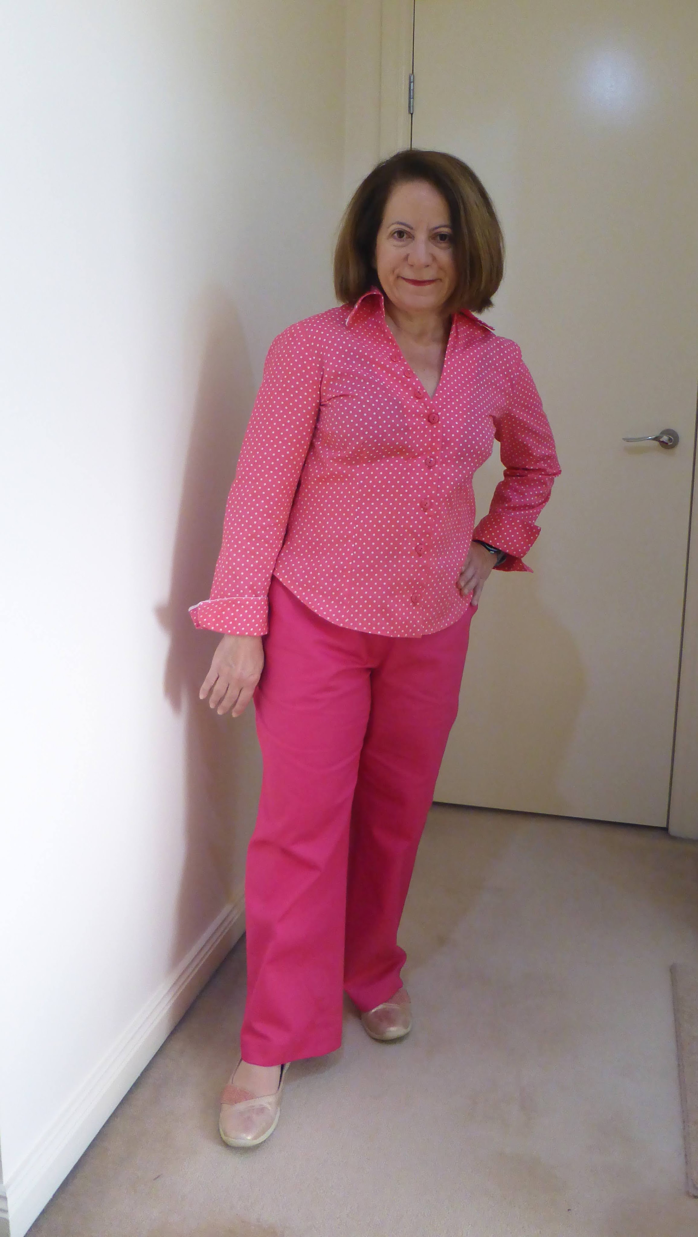 The colour is a ‘dark’ pink. I tend to wear dark solid colours in skirts and trousers and yes, the aim was to match the shirt I made last month.