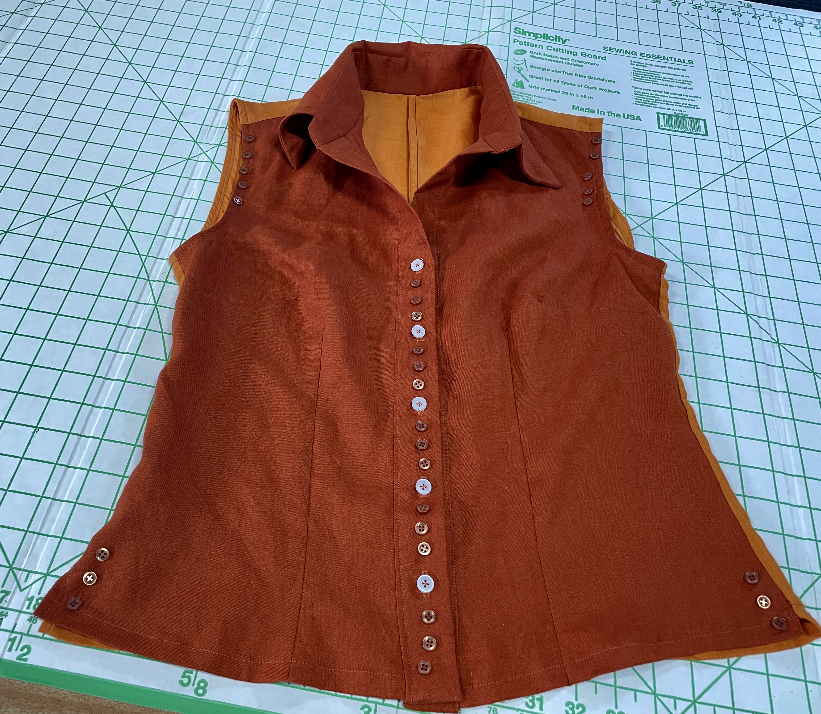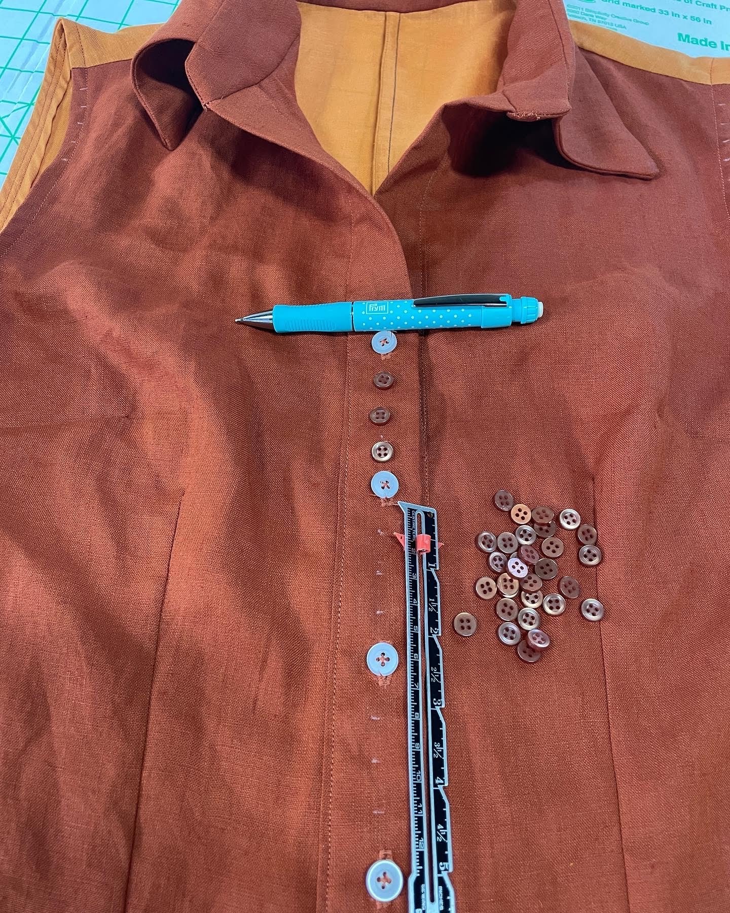 By Day 2, I’ve used white buttons from my stash as the ‘real’ buttons. This means each button has a buttonhole sewn as the shirt closure. The brown buttons were a frocktails gift bag notion and this photo shows you how I’ll add these buttons to this shirt, when I get some ‘downtime’ to hand sew these buttons.