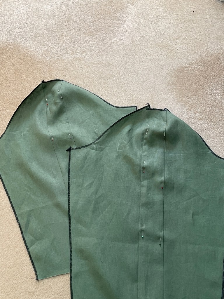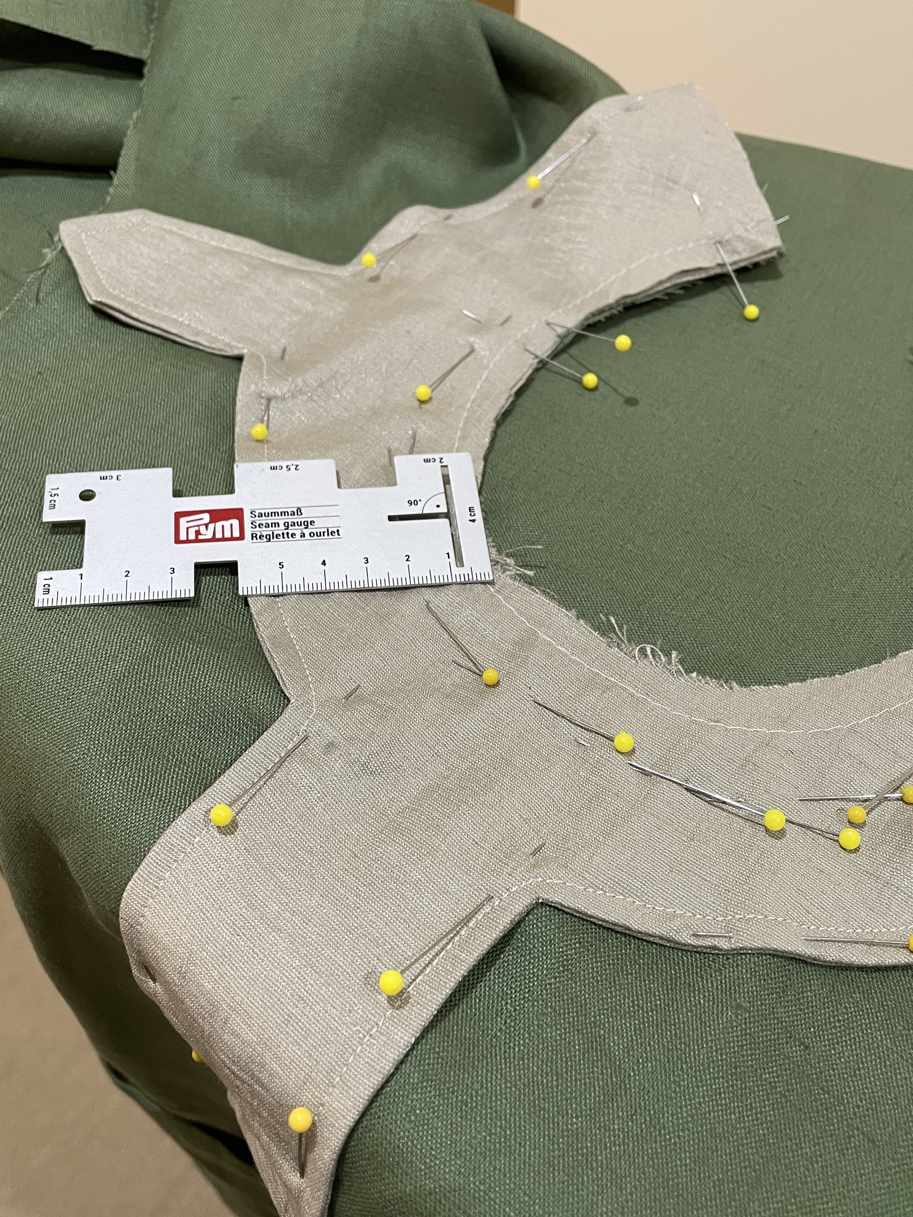 For the next dress, I’ve taken 2.5cm off the pocket length and raised the position of the pockets by 2cm on the dress front. Once I positioned the pockets on the front, I checked to make sure they sat evenly from the centre front fold. Balance is important on this dress.