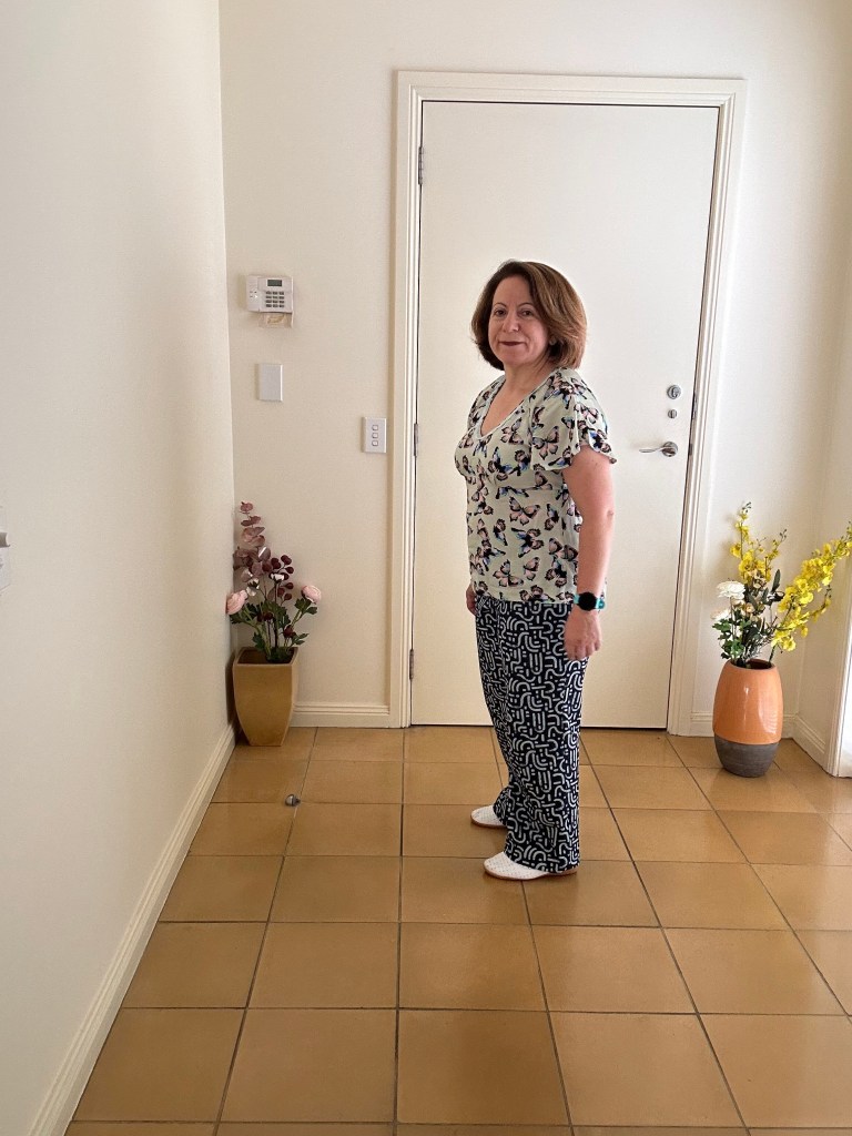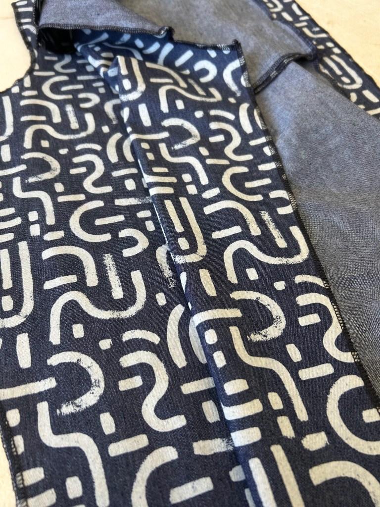 This top is a remnant from the Minerva Exclusive Expressive Butterflies Viscose Challis print and the trousers use a stretch woven denim fabric with an abstract print. Together these fabrics are super fun and I wear them a lot now.