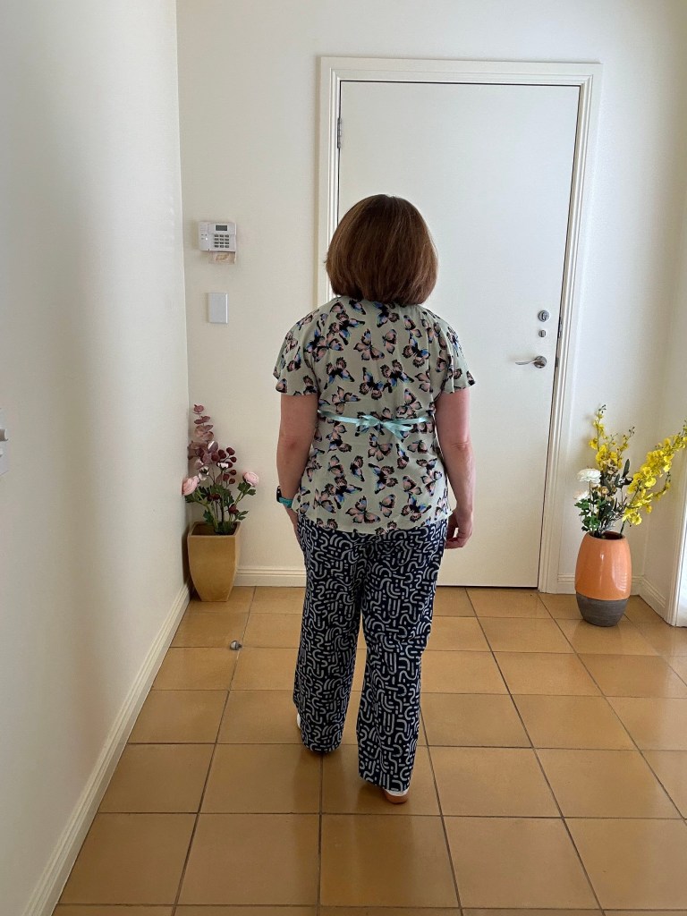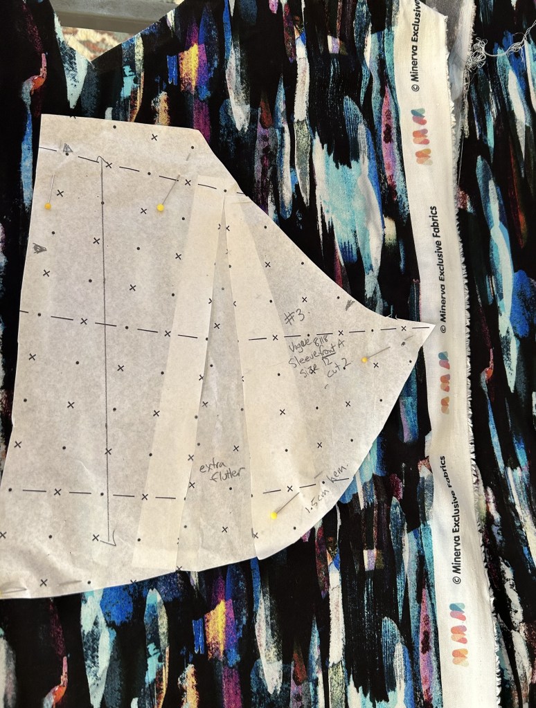 I’ve added more room at the back high hip area. I’ve also added more flutter to the front flutter sleeve pattern piece. On this top I’ve kept the sleeve length of the pattern. On the Ebbing Light print, I did shorten the flutter sleeve because it looked too long on that print.🤓