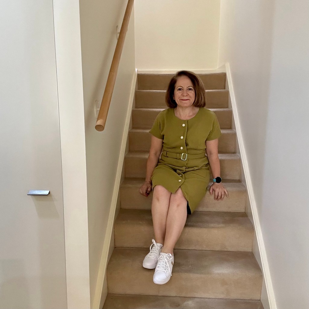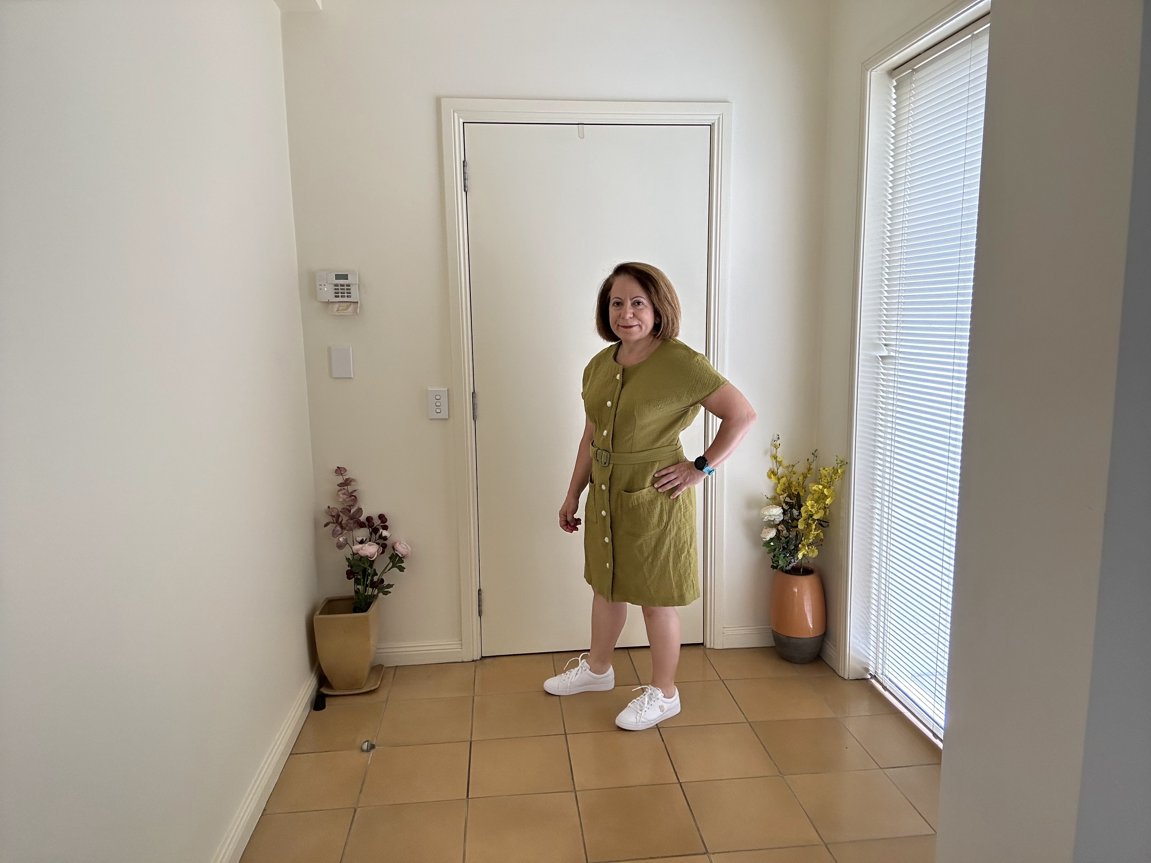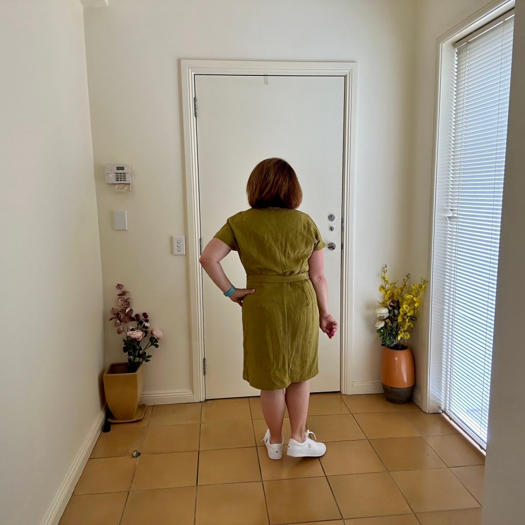 What I found on the day I wore this dress is that it’s a comfortable fabric to wear. Also the centre front has a wide buttonhole overlap on it so when you sit down, the fabric doesn’t open up and expose your skin.