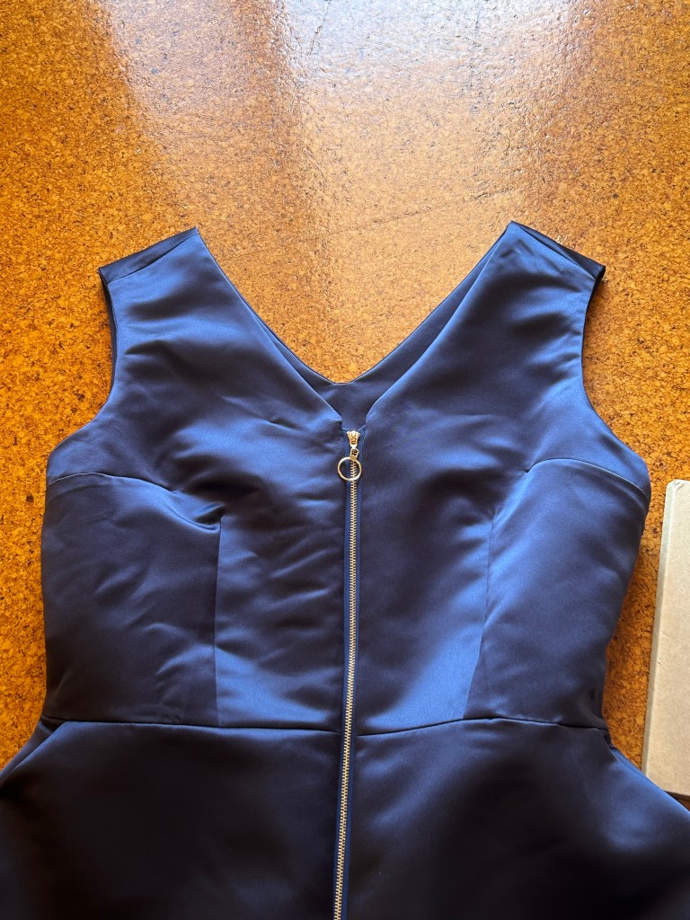 The duchess satin navy dress now has the front zip sewn in and I’m now hemming it so I can wear it to frocktails soon. The pattern is Papercut patterns and it’s the Yoyo dress.