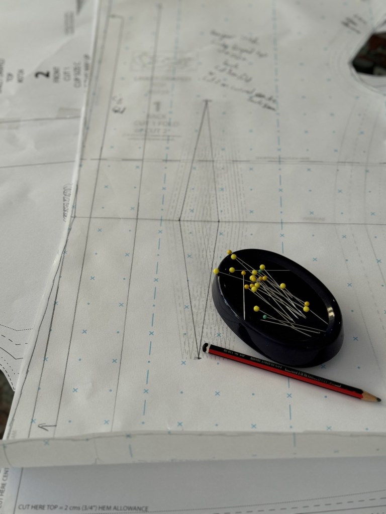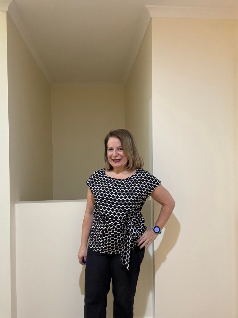 The black and white print showed me the back needed a sway back adjustment. I chose size 5 and shortened the hem by 3 cm. Sewing the front folds was my only challenge on the first top. My test top was not the best fabric choice but it did show me how the instructions Ann provides are super helpful. Her pattern drafting works so well.