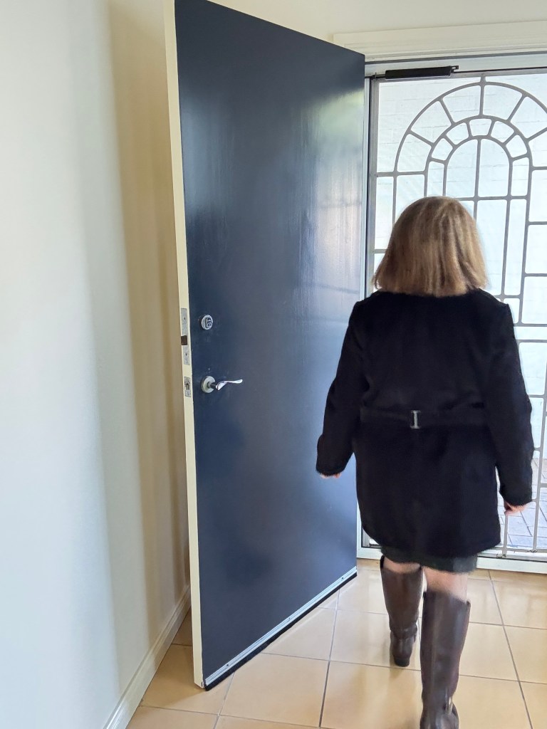 Here’s something to avoid for new sewists. When you’re hemming a black coat, don’t wear black trousers to check the coat length.