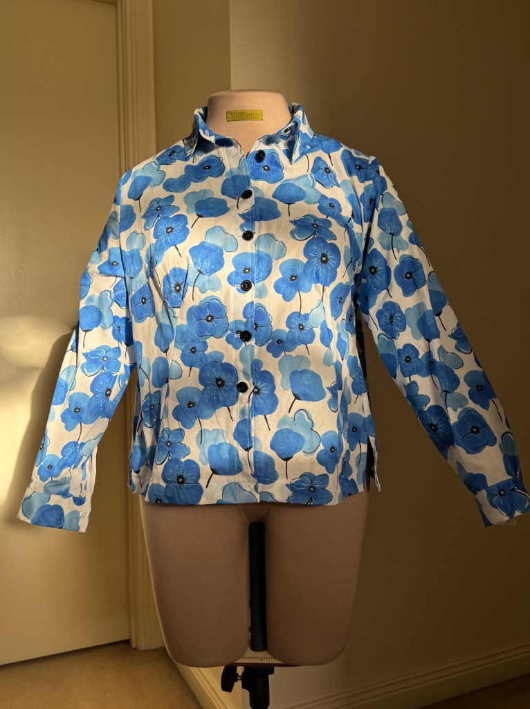 My earlier Riley shirts had side front ties, but this one is all about that timeless shirt vibe. Here’s the twist: this style loves drapey fabrics… and this print isn’t drapey. So, I added angled front darts for shape.