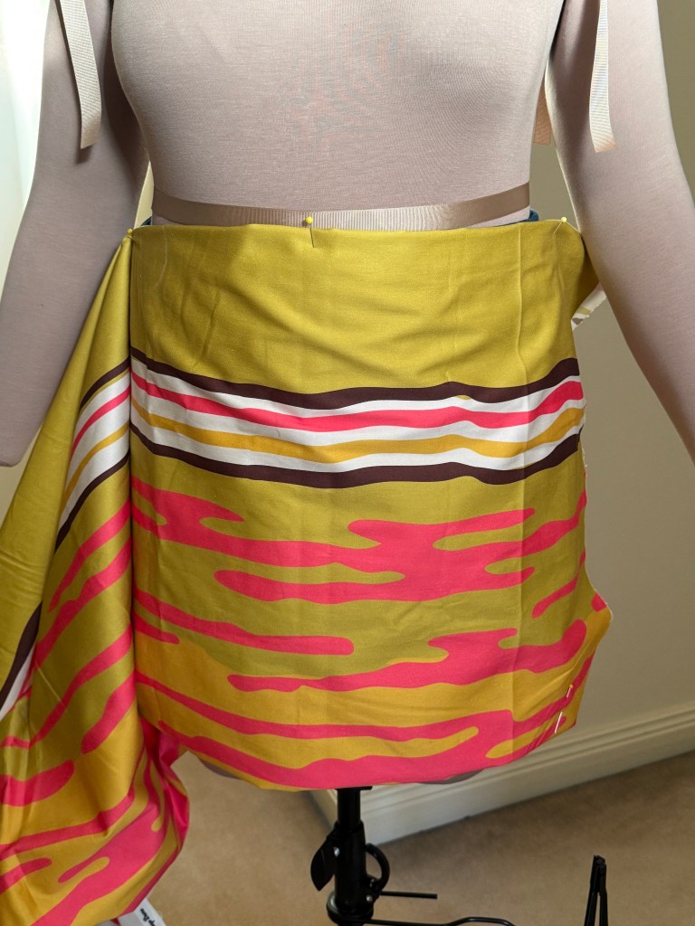 All the fabric elements were used to highlight this dress style. Lots of ‘jigsaw balance’ used to make the most of this print.