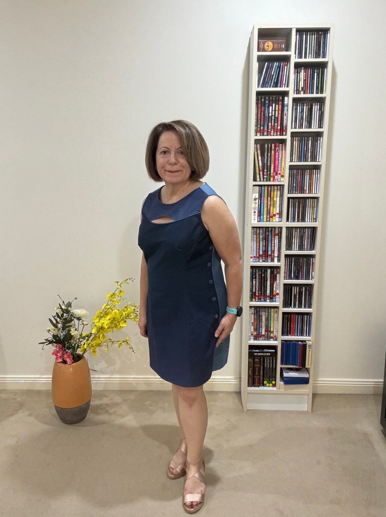 A bit of piping on the neckline gave the neckline some interest. If you like jigsaw puzzles, playing with the various shades of Blue Steel on the dress panels was motivating.