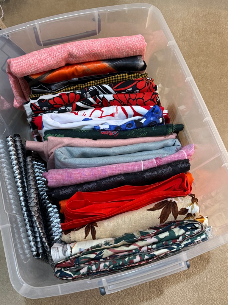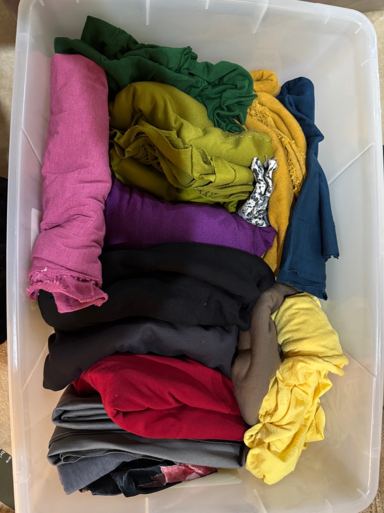 This week I tried my hand at repositioning fabrics in containers after watching a Stash Hub instagram post. The concept is to line up your folded fabrics together on their edge so you can see everything that’s in the container.